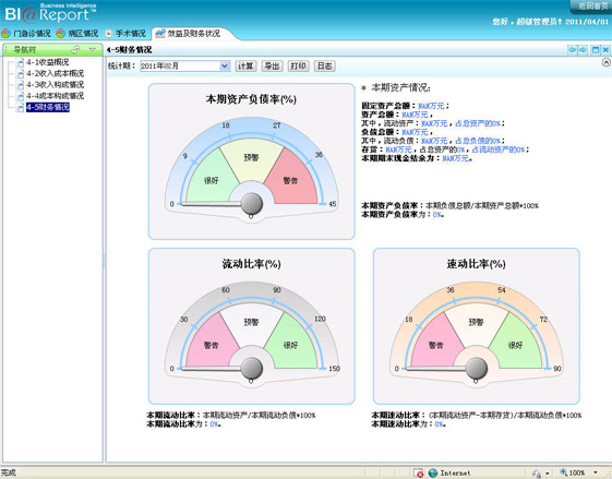 對(duì)于平均住院日及病床使用率等關(guān)鍵指標(biāo),我們通過(guò)儀表盤的方式進(jìn)行展現(xiàn),通過(guò)與目標(biāo)值的比較得出關(guān)鍵指標(biāo)是否達(dá)標(biāo),并通過(guò)儀表盤上指針的指向能夠快速獲得關(guān)鍵指標(biāo)的達(dá)標(biāo)信息。