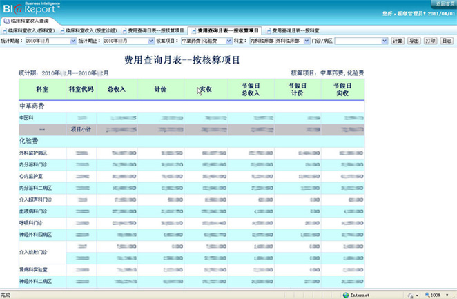 收入的查詢還可以分科室按照核算項(xiàng)目進(jìn)行查詢,如下圖: