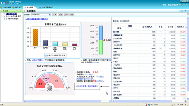 對(duì)于手工工作量我們通過(guò)按照科室進(jìn)行排名,并將全院手術(shù)目標(biāo)完成情況通過(guò)儀表盤的方式進(jìn)行展現(xiàn),通過(guò)指針指向能夠快速了解手術(shù)指標(biāo)完成情況。