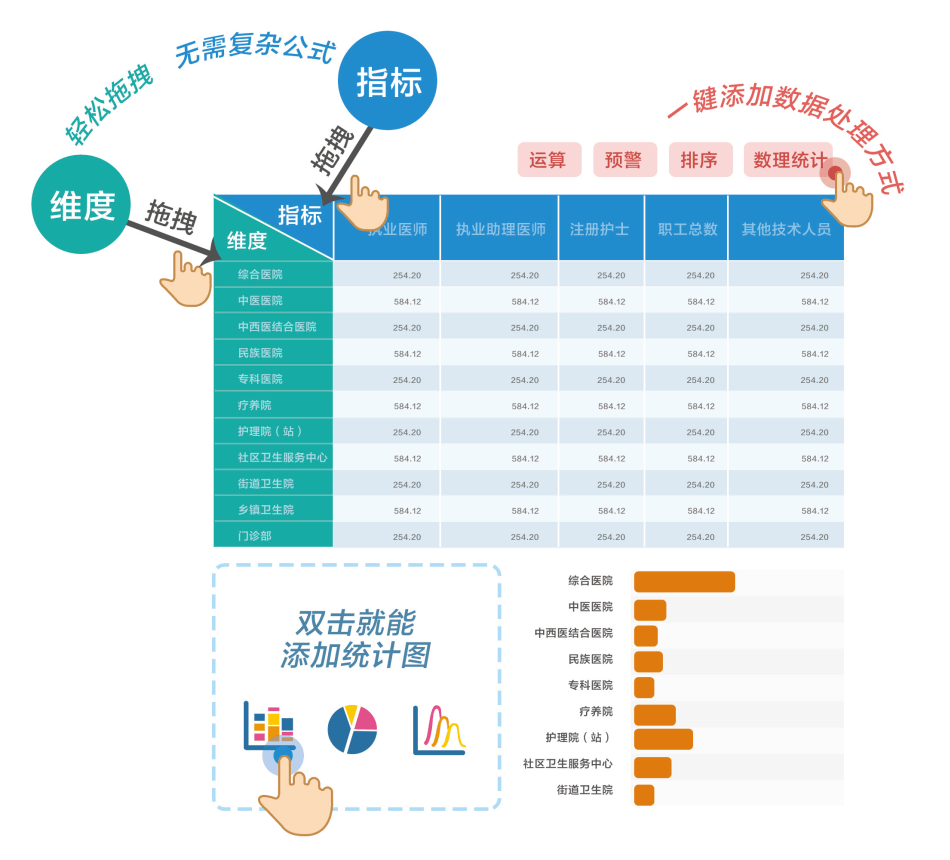 完全面向業(yè)務(wù)人員,充分理解當(dāng)下業(yè)務(wù)人員渴求自主探索數(shù)據(jù)的心情,只需要簡單的鼠標(biāo)拖拽維度和指標(biāo),即可快速生成圖表。點選式數(shù)據(jù)預(yù)處理,智能的圖表推薦,全程無需編寫表達(dá)式,零學(xué)習(xí)成本,一分鐘上手。敏捷看板中不僅內(nèi)置多種數(shù)據(jù)統(tǒng)計函數(shù),如:求和,最大值,排名,同比、環(huán)比、上期等,而且支持自定義維度和指標(biāo),兩者可以一鍵切換,靈活簡便的分析方式,方便用戶進(jìn)行猜想式、求證式的數(shù)據(jù)探索。