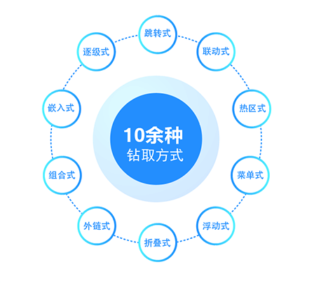 提供了十余種鉆取方式,并采用向?qū)降亩x,鉆取方式包括:逐級式、跳轉(zhuǎn)式、聯(lián)動式、熱區(qū)式、菜單式、浮動式、折疊式、外鏈?zhǔn)健⒔M合式、嵌入式等。