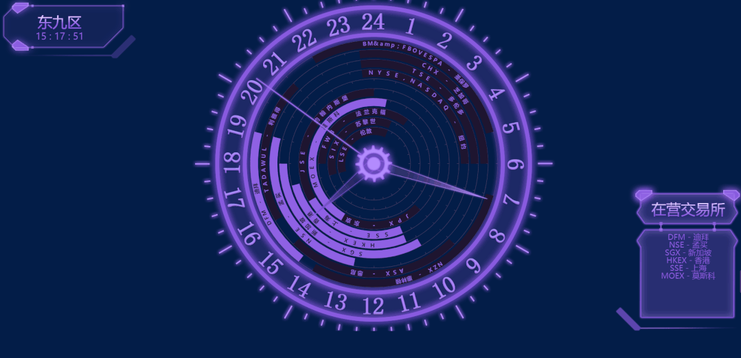 04 大屏可視化組件--輔助圖表 輔助圖表通常圍繞視覺中心的四周,起到錦上添花的作用,用來呈現(xiàn)次要指標,從各種維度進一步細化核心指標。 不需要設置任何數(shù)據(jù),實時顯示的當下時間,并且以時鐘表盤的方式,古典有韻味。
