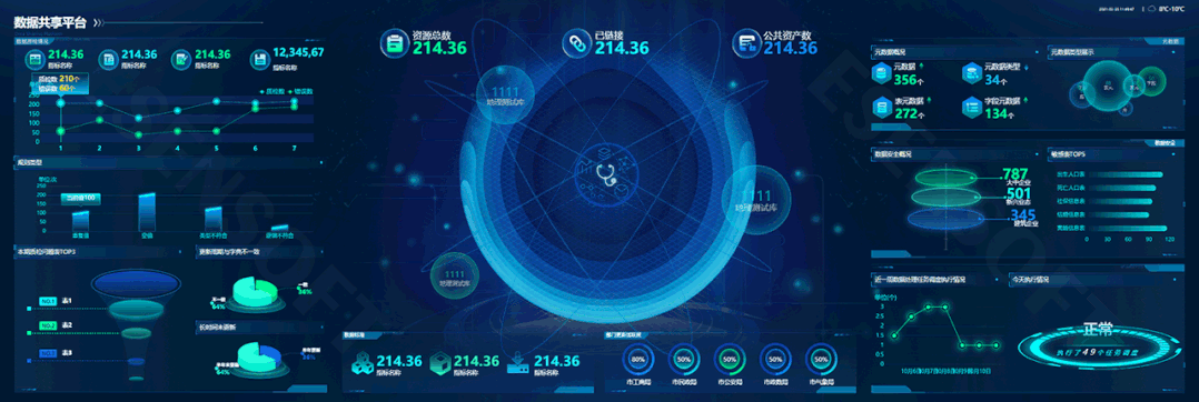 再者,設計人員需要明確大屏的視覺路線即展示路線,這條線能講出怎樣的故事跟你的布局構圖密切相關。下面提供幾種常見的構圖思路,希望對大家有所啟發和幫助。 1、中心放射型 以中間核心內容向周圍放射,正中多以地圖和給人視覺沖擊的主視覺為主,起到聚焦凸顯的作用,層次明晰,主次分明。 2、故事線型 該類型主要是依靠建設一條完整的視覺導線,引導觀看者從一端往另一端吸收信息,該構圖簡單易懂,比較適合有嚴格順序的數據信息,例如企業的展示大屏等。 3、數據平鋪型 這是一種最為普遍的構圖手法,一般是將同級別的數據信息一起展示出來,區塊清晰明確一目了然。但即使是平鋪,也是有輕有重,一般以板塊劃分的大小來界定分配。 配色篇亂花漸欲迷人眼